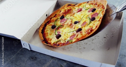 © vectorfusionart, Fototapeta premium Lifting thin-crust pizza on metal spatula in white box on gray tabletop, showing pepperoni, olives
