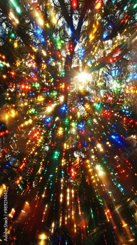 © Truprint, Naklejka premium Light aberration, vibrant abstract depiction of multicolored lights bursting through tree canopy, capturing essence of light diffraction in nature. wonder and beauty of natural light play.