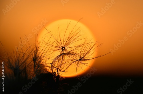 © Evgeniya Fedorova, Obraz premium Light, air blades of grass against the backdrop of an orange setting sun. The composition of the seeds of plants in orange and black colors. Beautiful sunset landscape in macro photography.