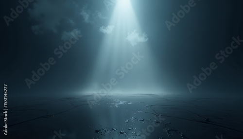 Fototapeta premium Light beam over dark floor with fog and clouds