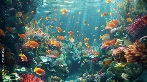 Naklejka premium Light Beams Shining Through Ocean in Coral Reef