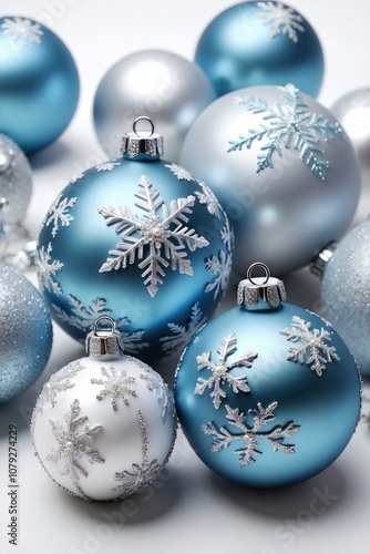 Fototapeta premium Light Blue and Silver Christmas Ornaments and Snowflakes on a Pure White...