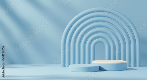 © 5 Grace Media, Obraz premium Light blue minimalist product display with two circular pedestals and a rainbow arch