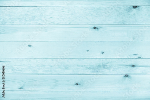 © blinova, Naklejka premium Light blue neon wooden background made of natural wood. The view from the top. Natural untreated planed texture of the rocks of the pine. The surface of the table to shoot flat lay. Copy paste