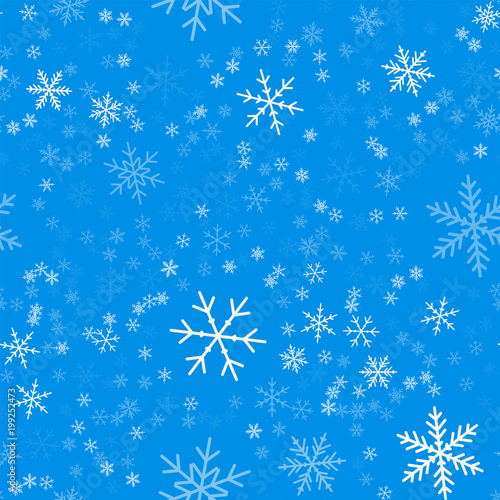 Fototapeta premium Light blue snowflakes seamless pattern on blue Christmas background. Chaotic...
