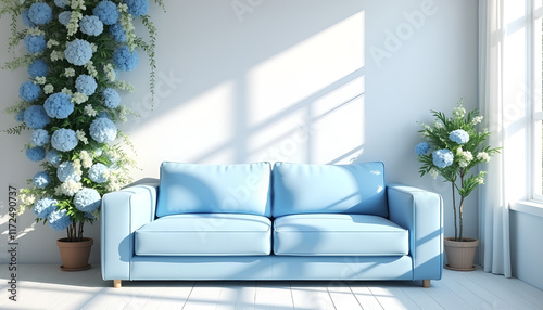 © Irina, Fototapeta premium light blue sofa in modern living room with flower wall and natural light
