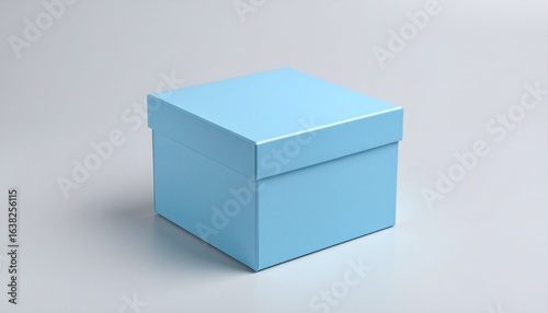 © Adobe, Fototapeta premium Light blue square gift box with a lid on a simple gray studio background.