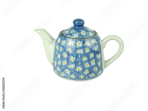 Obraz premium Light blue teapot with white flower pattern isolated on a white background....