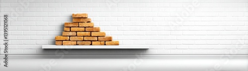 Obraz premium Light Brown Brick Stack on White Shelf Against White Brick Wall