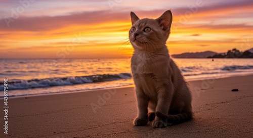 © Matt, Obraz premium Light brown cat with white chest and paws sitting on beach at sunset