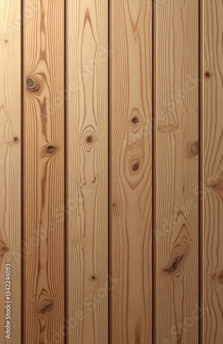 © Pete, Fototapeta premium Light brown wood wall panel with beautiful natural patterns. Abstract wooden texture, close-up shot, vertical planks, vintage wallpaper design, space for work presentations, interior finishing,