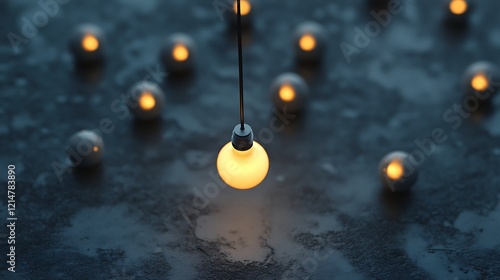 Fototapeta premium Light bulb hanging from a black wire glowing softly surrounded by unlit bulbs on a gray surface
