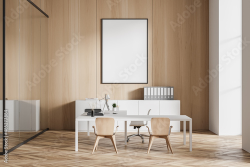 Fototapeta premium Light business room interior with furniture and computer. Mockup poster