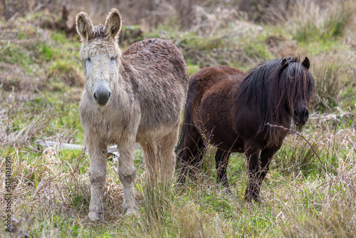 © LFRabanedo, Fototapeta premium Light colored donkey and dark brown pony with long manes.