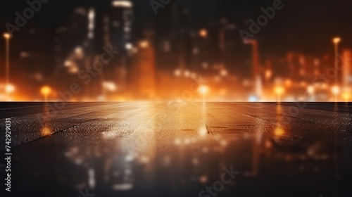 Obraz premium Light effect, blurred background. Wet asphalt, night view of the city, neon reflections on the concrete floor. Night empty stage, studio. Dark abstract background, dark empty street. Night city