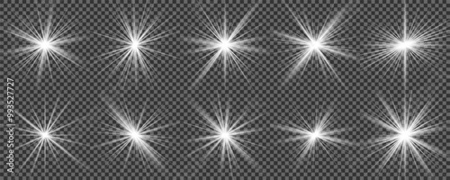 Fototapeta premium Light effect set. Glow isolated white transparent light effect set, lens flare, explosion, glitter, dust, line, sun flash, spark and stars, spotlight, curve twirl. Sunlight, abstract special effect.