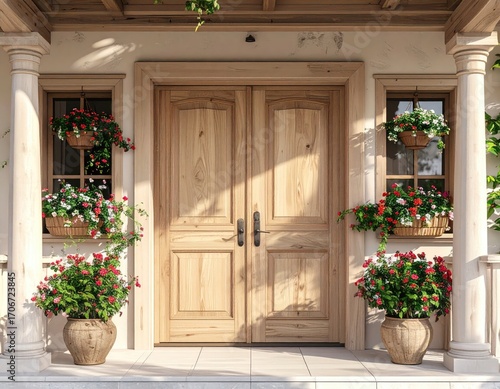 Fototapeta premium Light-filled porch with double wooden doors and potted flowers