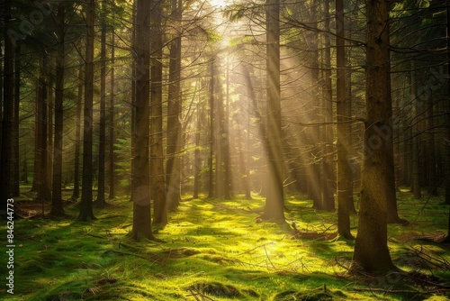 © nattapon98, Obraz premium Light filtering through trees in a forest,