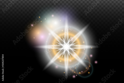 © Naya Chu, Obraz premium Light flash effect with flares and glow on a transparent background. Magical glow, shining light, star, optical flares for design, photomontage, New Year, and festive projects.
