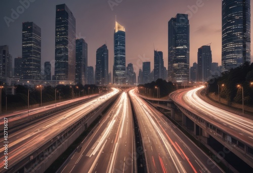© Rezhwan, Fototapeta premium Light flow of traffic on a evening highway in a city with modern high buildings