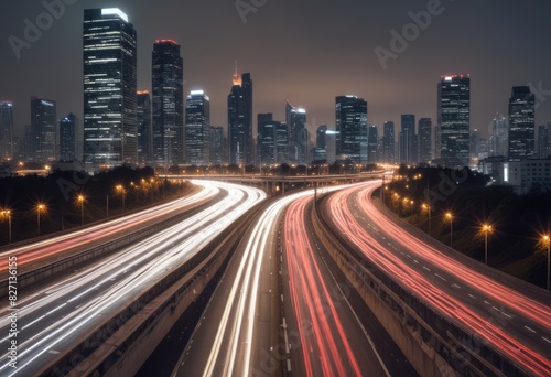 © Rezhwan, Fototapeta premium Light flow of traffic on a evening highway in a city with modern high buildings