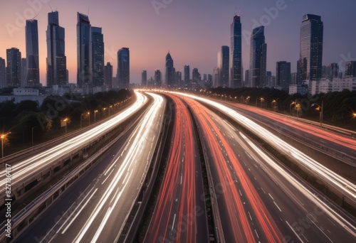 © Rezhwan, Fototapeta premium Light flow of traffic on a evening highway in a city with modern high buildings
