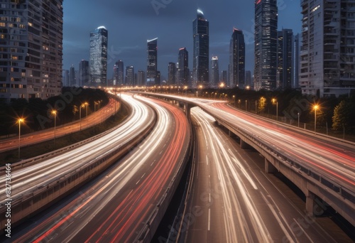 © Rezhwan, Fototapeta premium Light flow of traffic on a evening highway in a city with modern high buildings