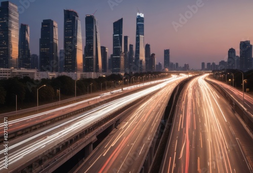 © Rezhwan, Fototapeta premium Light flow of traffic on a evening highway in a city with modern high buildings