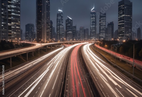 © Rezhwan, Fototapeta premium Light flow of traffic on a evening highway in a city with modern high buildings