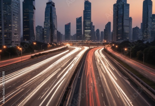 © Rezhwan, Fototapeta premium Light flow of traffic on a evening highway in a city with modern high buildings