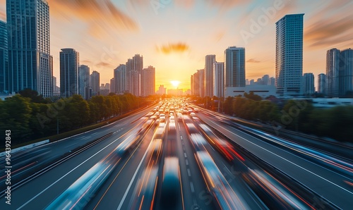 © Mona - Design, Fototapeta premium Light flow of traffic on a evening highway in a city with modern high buildings