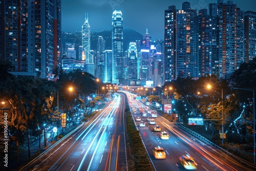 Fototapeta premium Light flow of traffic on a nighttime highway in a city with modern high...