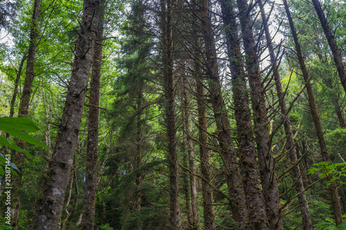 Naklejka premium Light from above filters down through forest canopy to the forest floor beneath.