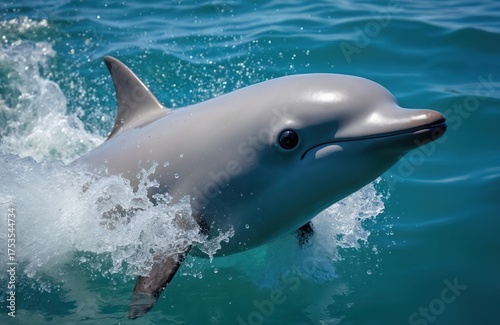 © miss irine, Naklejka premium Light gray marine mammal jumps from blue ocean water. Porpoise dolphin splashes drops surfacing. Animal swims in sea, shows head, dorsal fin above waves. Creature represents important ocean life,