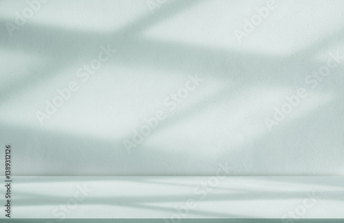© Anchalee, Obraz premium Light Green Background,Light and Shadow on Wall Texture,Studio background with podium for spring product,Summer backdrop light blue concrete wall with shadow from window reflection on cement floor