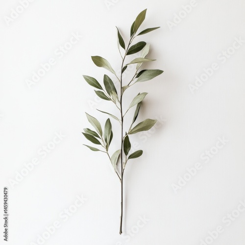 © abdul, Fototapeta premium Light green branch with leaves against a white background. A simple, elegant arrangement of foliage