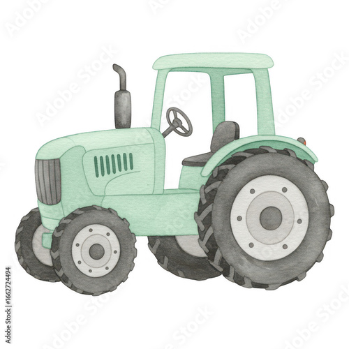 © Raitalinn, Obraz premium Light green watercolor tractor with large tires and exhaust pipe isolate