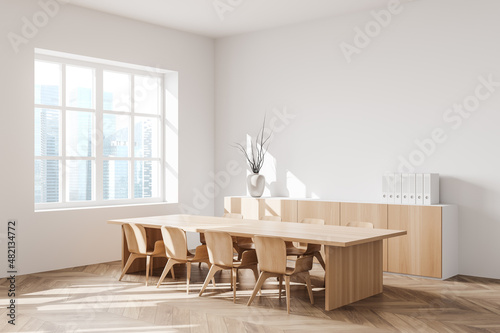 © ImageFlow, Fototapeta premium Light guest interior with seats, table and commode near panoramic window. Mockup