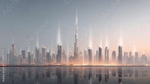© Tin, Obraz premium Light image depicting mobile network wires concept. Captivating skyline view showcasing modern skyscrapers at dusk.