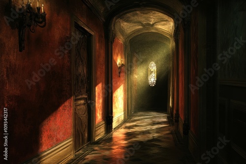 © AI Photo Stock, Fototapeta premium Light in the Dark Corridor - Mysterious hallway, sunlit window, antique doors, aged walls, gothic architecture. Secrets, mystery, exploration.