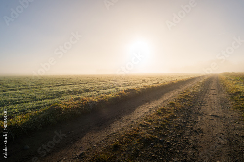 Naklejka premium Light mood in the morning mist at sunrise in the forest