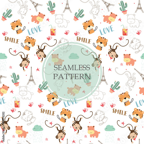 Fototapeta premium Light orange,white seamless pattern with tiger,hippopotamus,monkey and cactus
