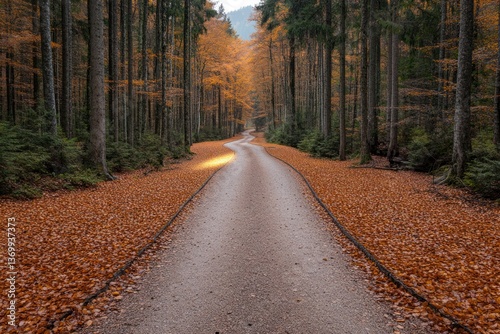 © Dennis, Obraz premium Light peeking through trees on autumn forest path