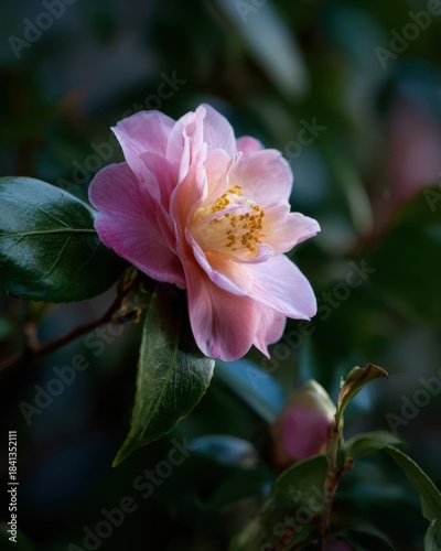 Fototapeta premium Light pink camellia flower with yellow stamens and green leaves bloom