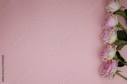 Fototapeta premium Light pink desktop flat photo with roses for a blog header or a post on social networks