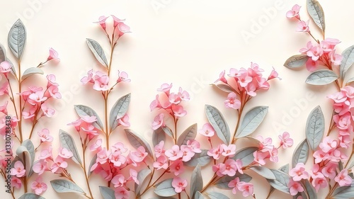 © Srinoun, Fototapeta premium Light Pink Flowers Gray Leaves Cream Background Flat Pattern Vibrant AI Photo