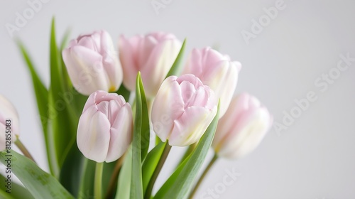 Fototapeta premium Light pink tulip bouquet on a plain background shot with soft light and a...