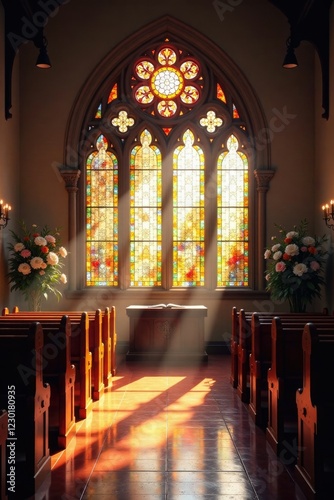 Fototapeta premium Light pours through stained glass windows of a sunlit funeral chapel, pews, flowers