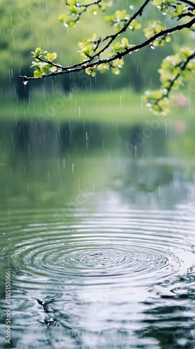 Naklejka premium Light rain falls on a tranquil pond reflecting budding trees in spring