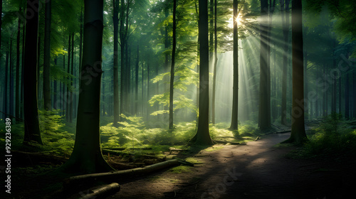 © MrJeans, Naklejka premium light shining into the green woods